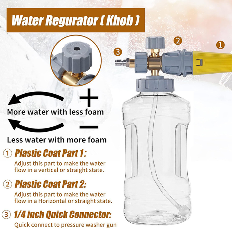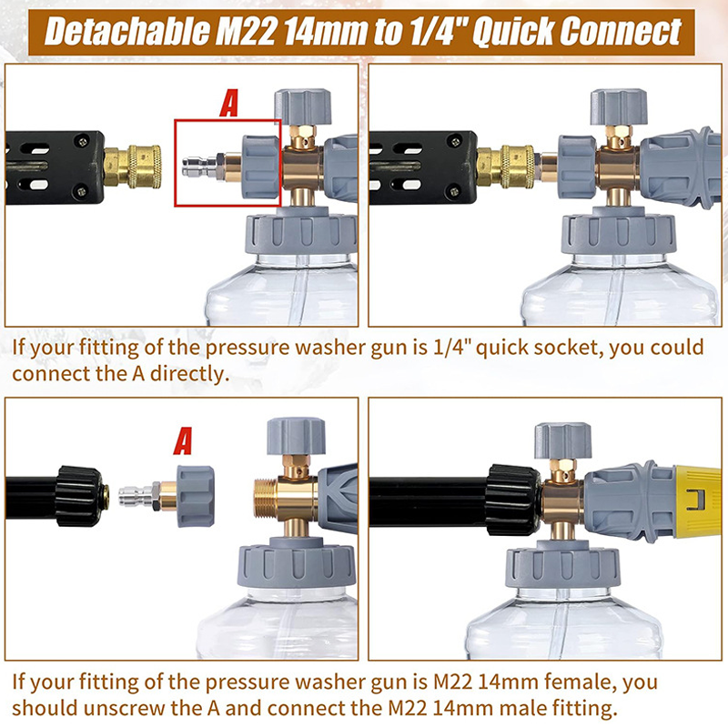 UNIVERSAL QUICK CONNECTOR - Equipped with a standard 1/4" quick connector and an included M22-14mm adapter, this foam cannon easily attaches to a wide variety of pressure washer guns for a secure and leak-free connection.