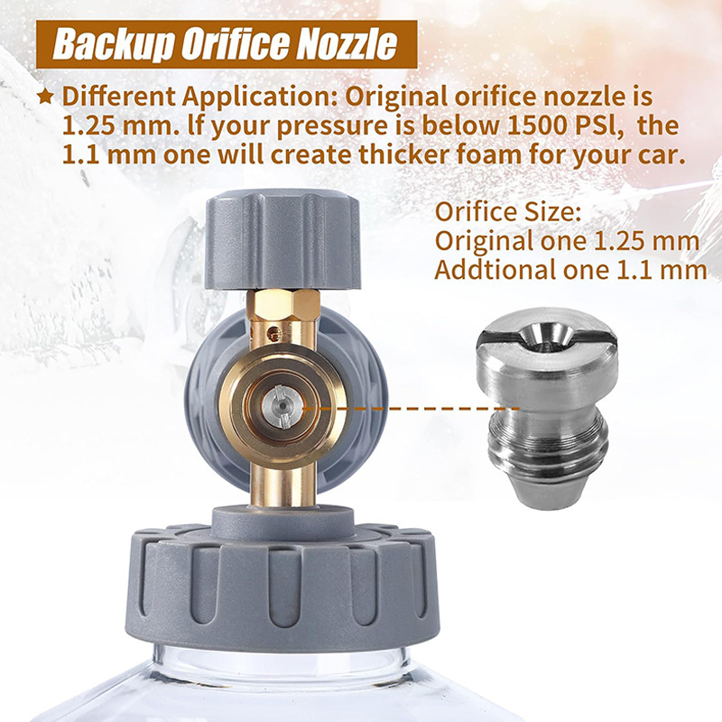 DUAL ORIFICE NOZZLES - Comes with a pre-installed 1.25mm orifice and an extra 1.1mm nozzle. This allows you to optimize foam output for your specific pressure washer, ensuring maximum foam thickness even with lower PSI units.